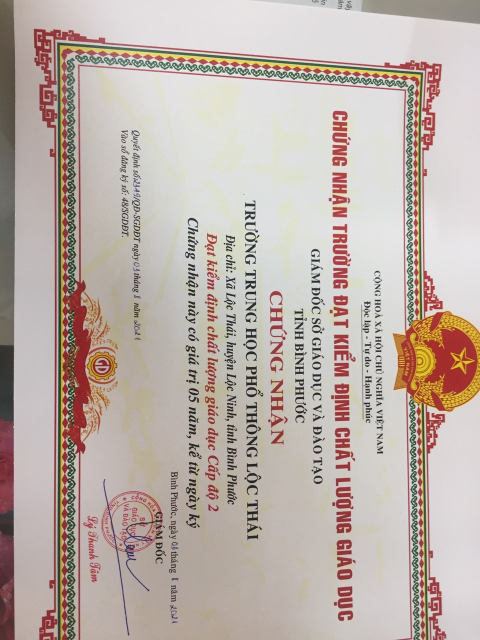 Quyết định công nhận và cấp Giấy chưng nhận đạt Kiểm định chất lượng giáo dục Cấp độ 2 đối với Trường THPT Lộc Thái